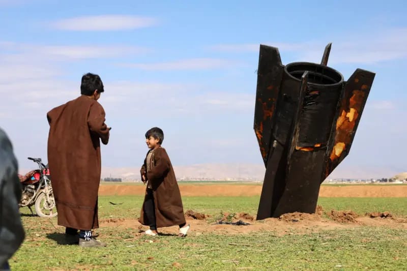 Crédito: AP (Un niño se aleja de un misil iraní que no ha explotado en el este de Siria este miércoles)